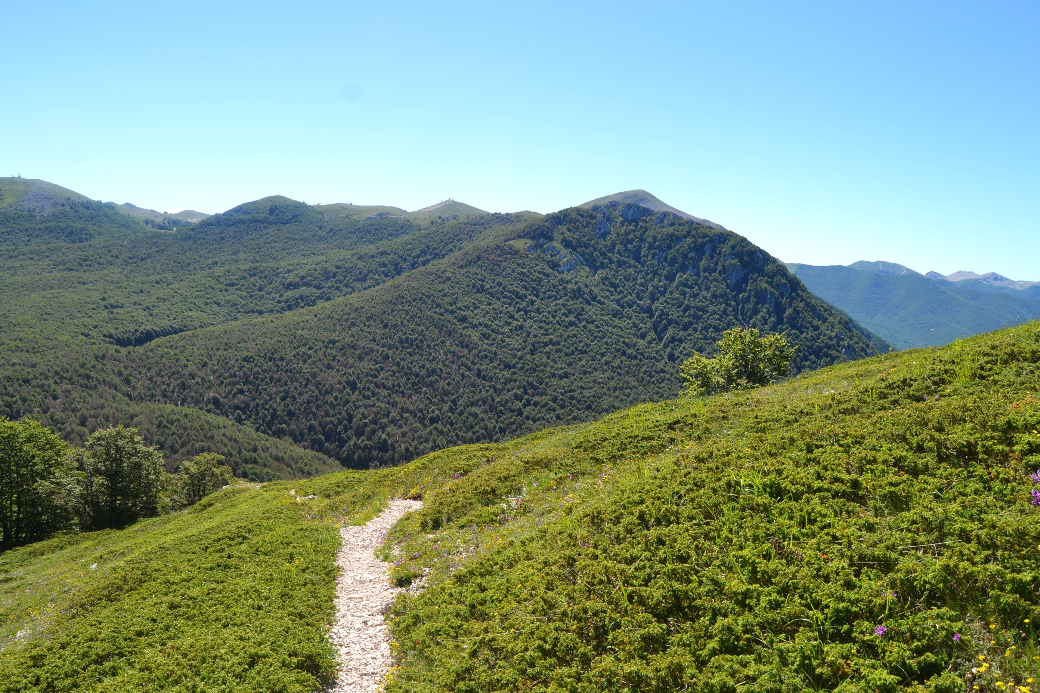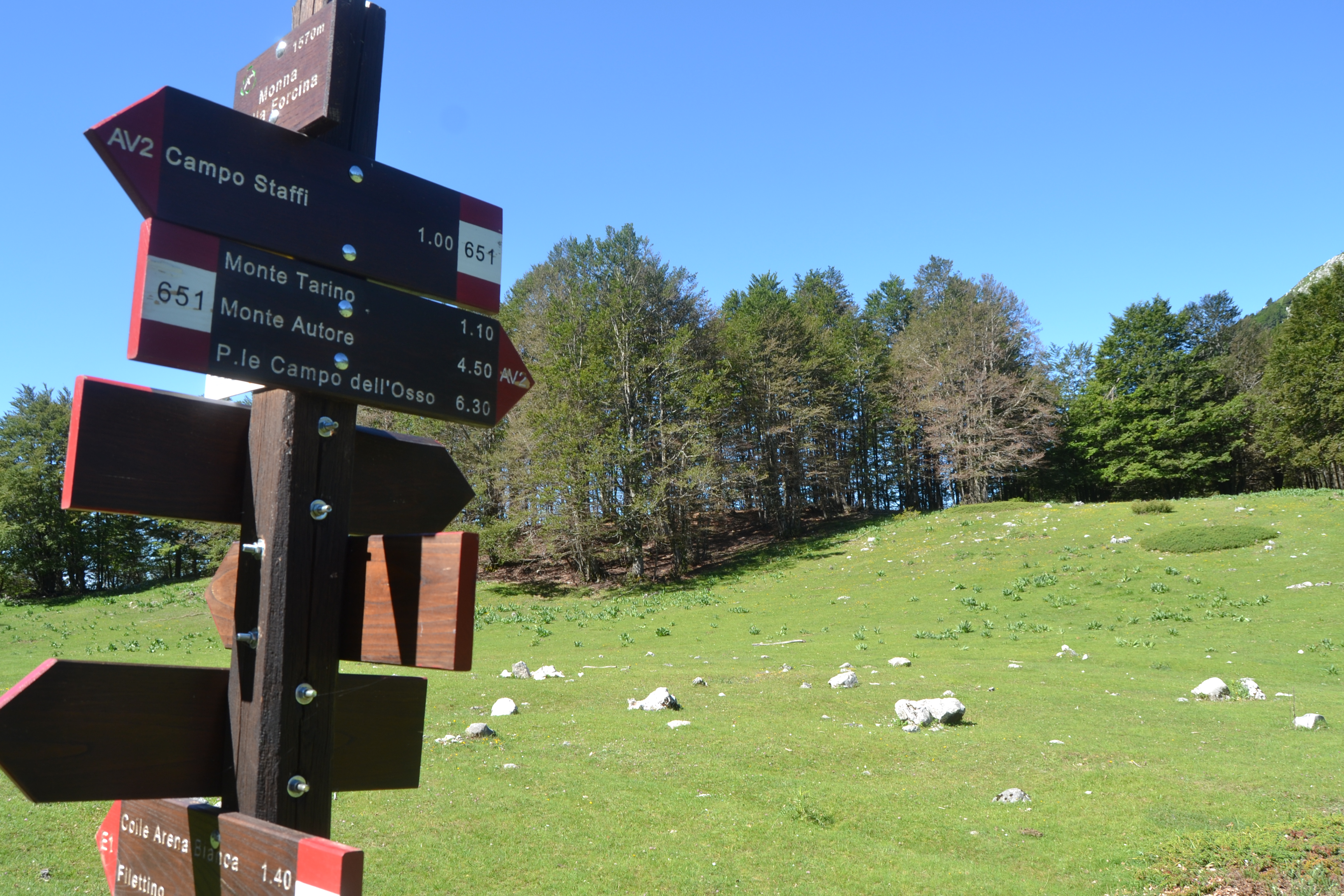 Il percorso è atipico perché inizia in discesa nella faggeta fino a raggiungere l’altopiano Monna della Forcina (1580 mt).
